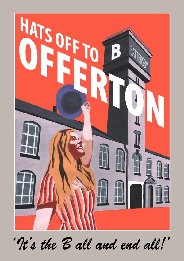 Offerton poster, featuring the Battersby hat factory and Imogen Francesca Hart